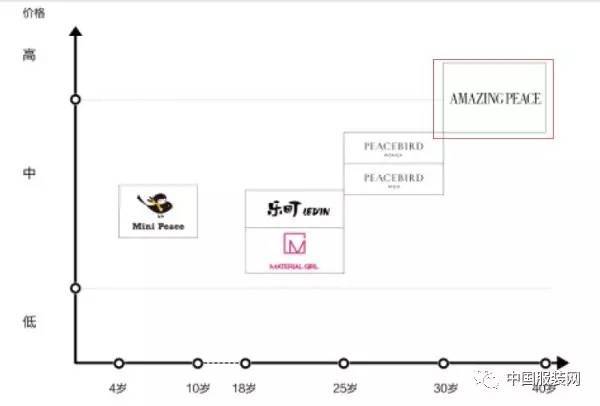 其中品牌梯度分为核心品牌、新兴品牌和初创品牌。太平鸟男装PEACEBIRD MEN毫无疑问是核心品牌,而初创品牌中AMAZING PEACE也是太平鸟的男装品牌组合之一。AMAZING PEACE创立于2014年,定位轻奢风格,有效覆盖18-40的消费群体,目前由太平鸟男装事业部培育发展。据太平鸟财据显示,2016年AMAZING PEACE的营业收入为1618.86万元,知名度较低,尚未实现盈利。 一个初创品牌要在短时间内赢得市场并非易事,加上定位于高端品牌,受众群体也相对较小,因还有待时间培育,希望不要被于“襁褓之中”。